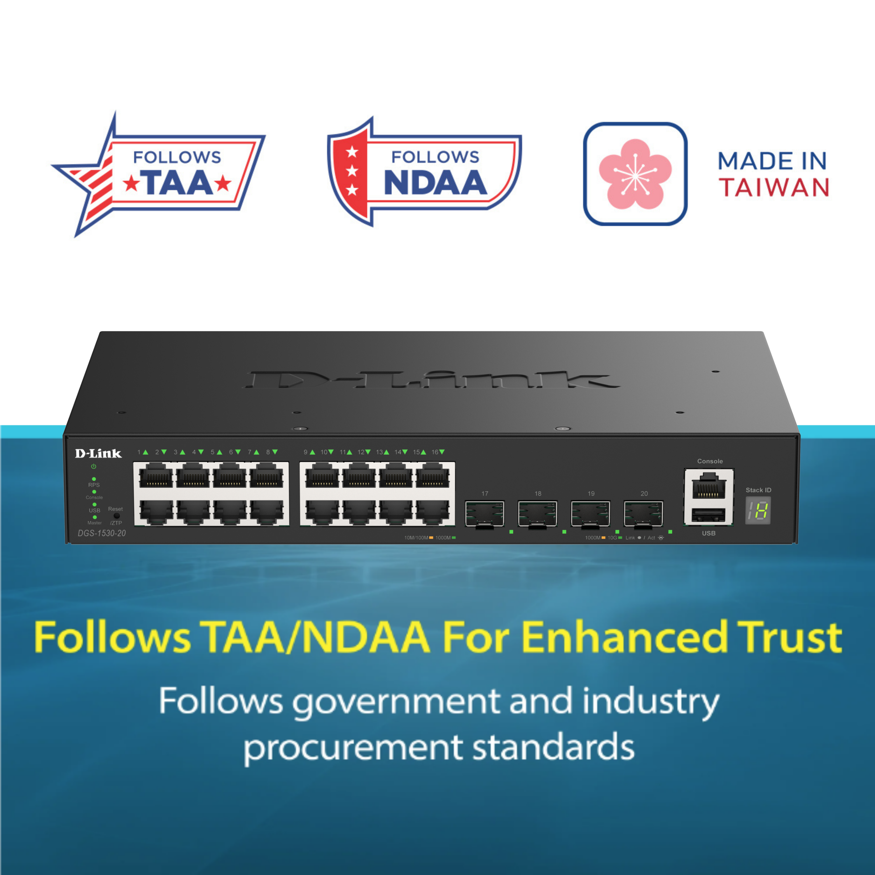 D-Link 20-Port Gigabit Stackable Managed Ethernet Switch 10GbE Uplinks (DGS-1530-20) | 16x 1GbE Ports + 4x 10GbE SFP+ Ports, L3 Lite, VLANs, Fanless, Desktop/Rackmount, Follows NDAA/TAA