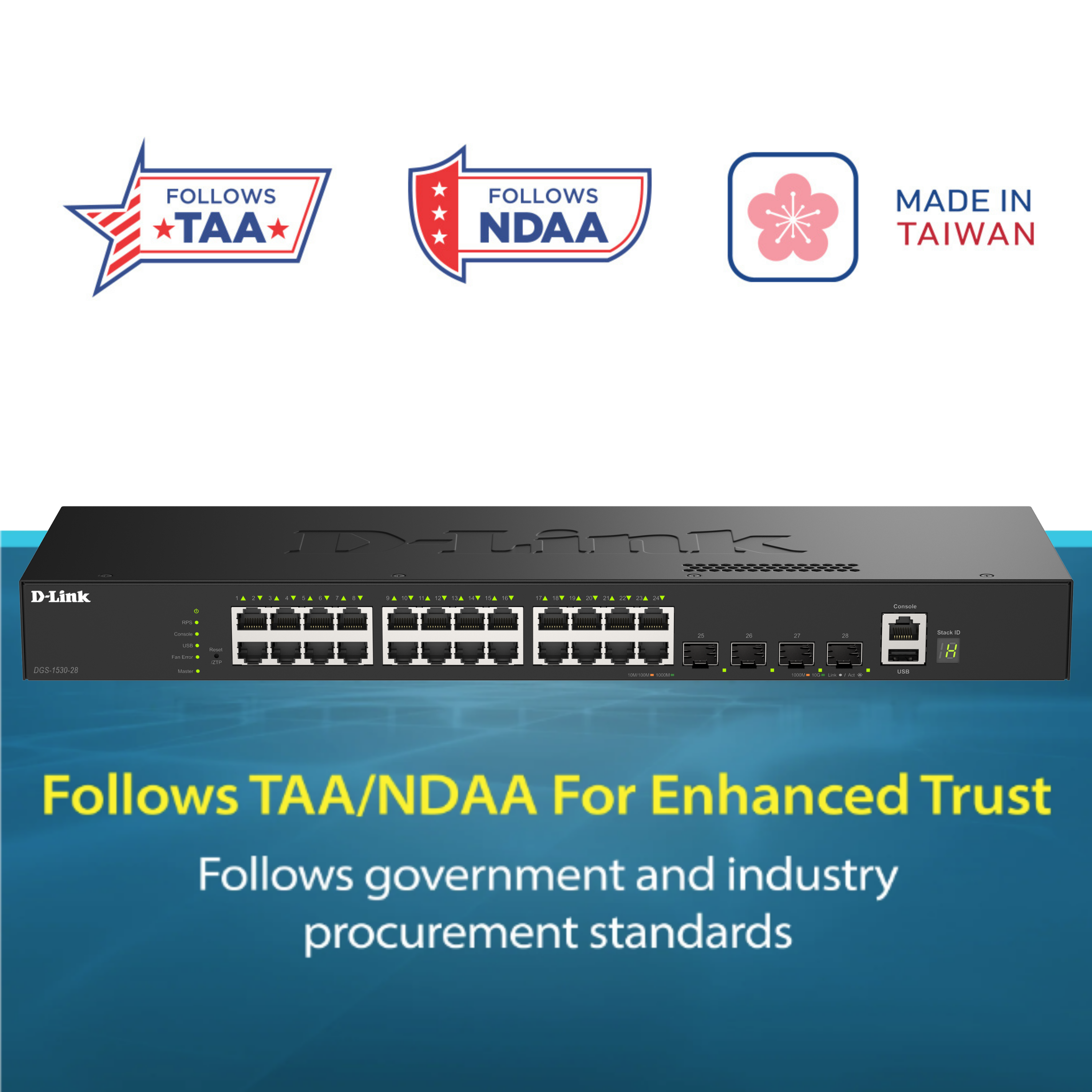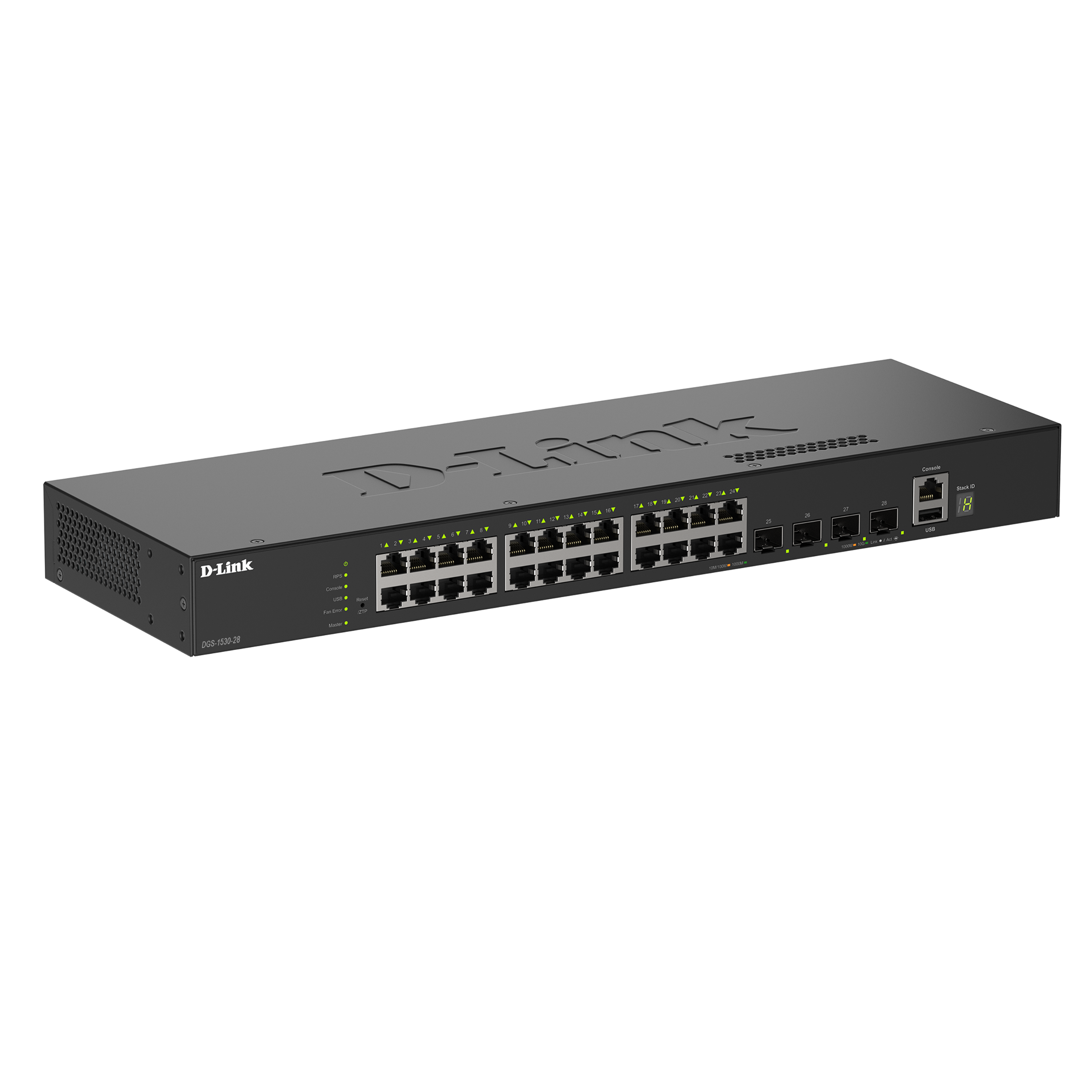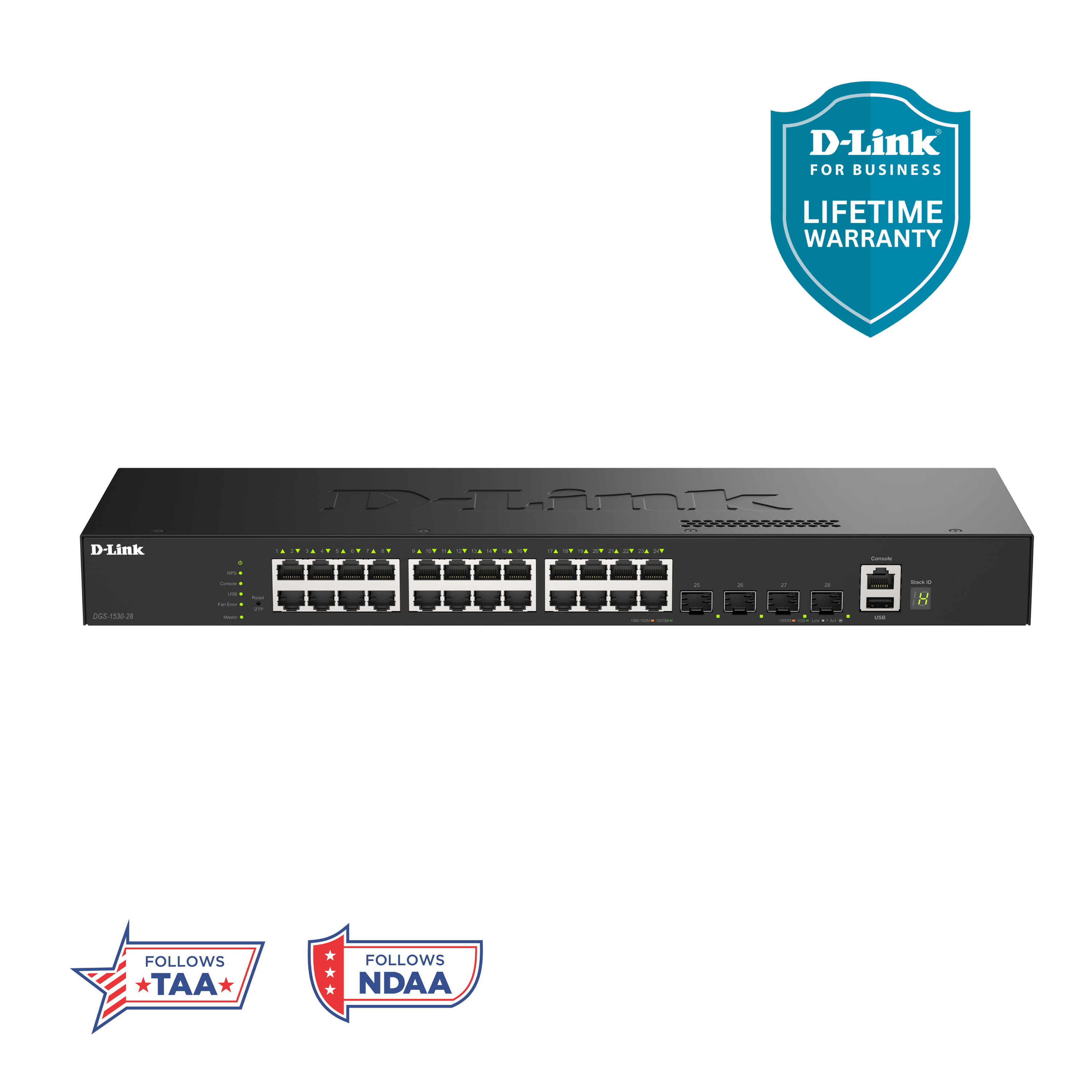 D-Link 28-Port Gigabit Stackable Managed Ethernet Switch with 10GbE Uplinks (DGS-1530-28) | 24 x 1GbE Ports + 4x 10GbE SFP+ Ports, L3 Lite, VLANs, Fanless Desktop/Rackmount, Follows NDAA/TAA