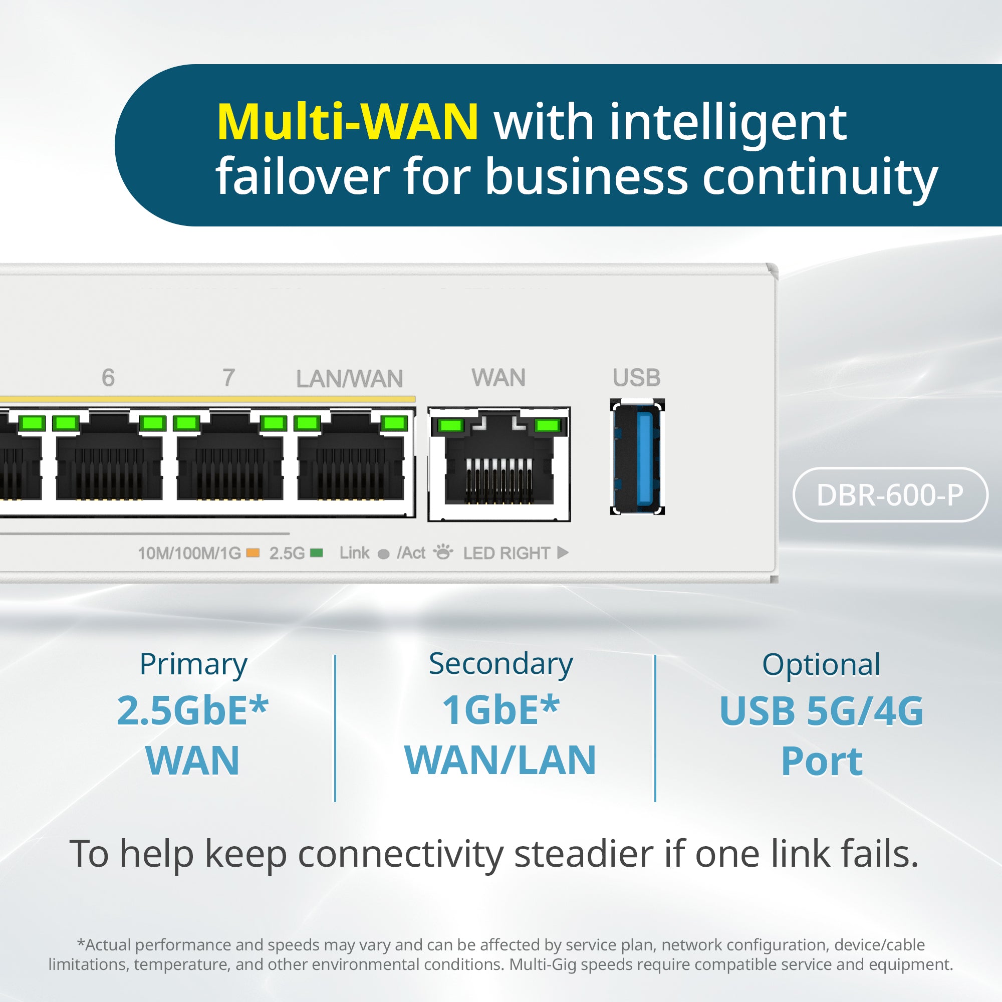 The D-Link Guardian 600 PoE Multi-Gig Router (DBR-600-P) supports multiple internet connections - a primary 2.5GbE WAN, a configurable WAN/LAN port, and a USB port for 4G/5G backup (USB modem not included; sold separately). This enables multi-WAN failover to help support business continuity: if the primary link goes down, traffic can shift to a backup. Load balancing can also be configured when you have more than one active WAN link and compatible service/modem setups, distributing traffic across those links. Actual results vary by network, provider and plan.