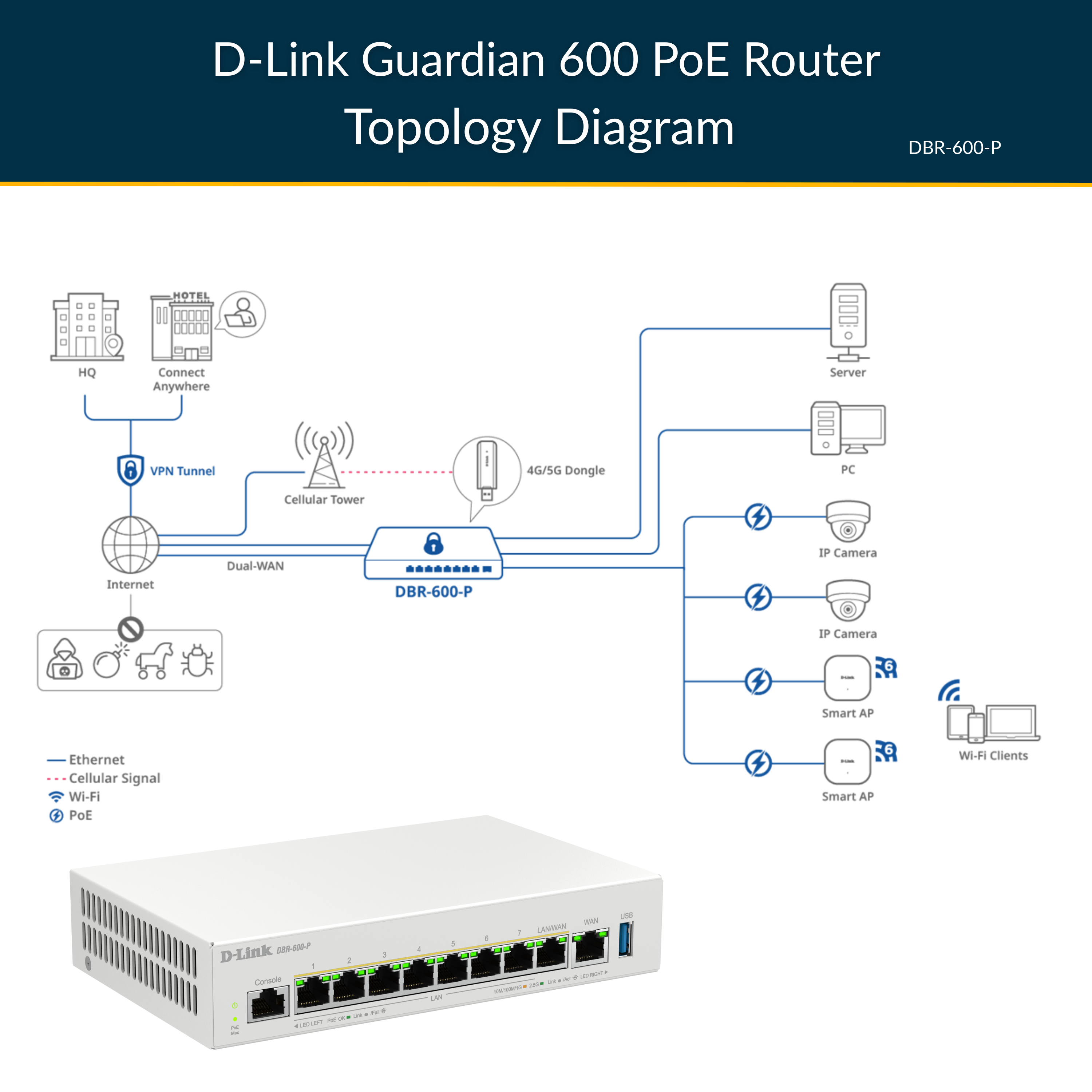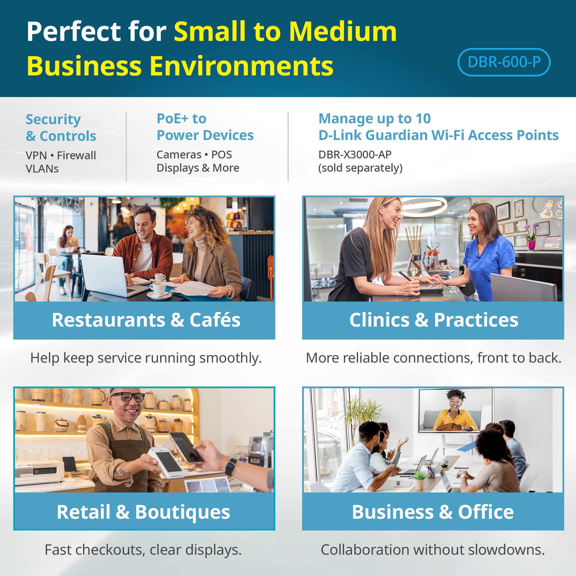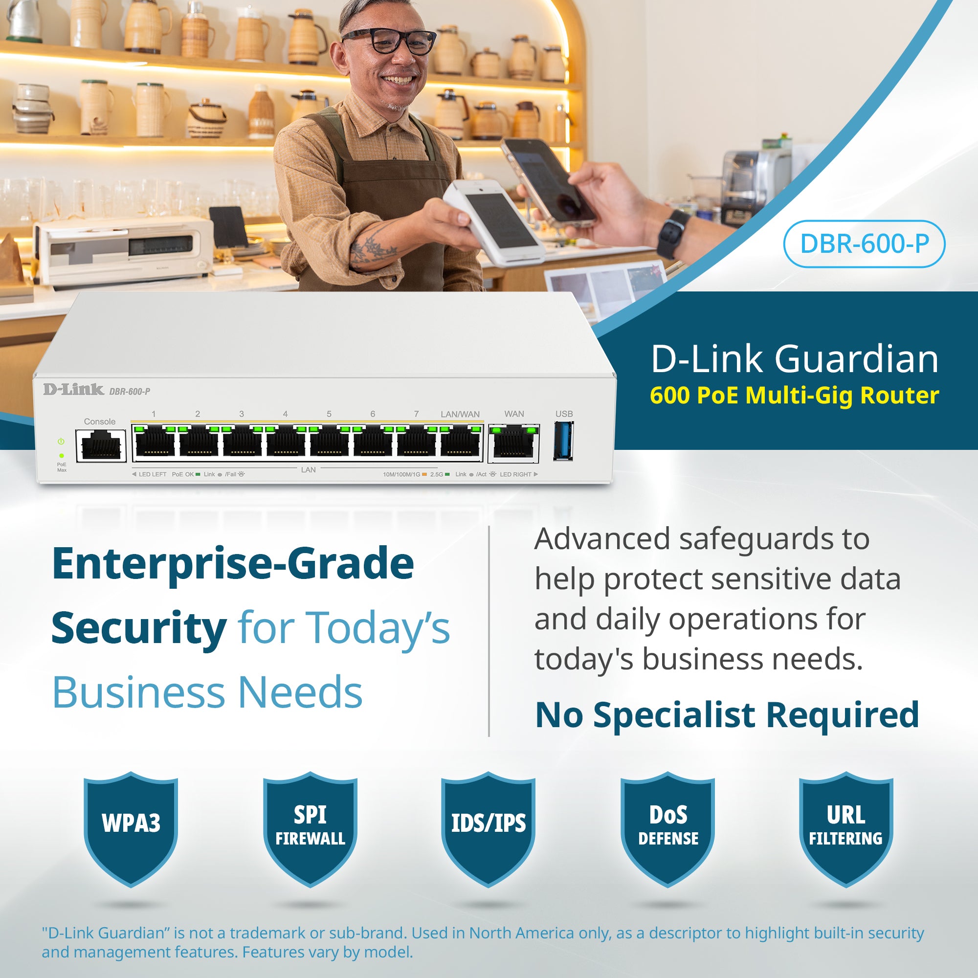 - Designed for small and medium sized businesses, Whether you're running a café, clinic, retail chain, or growing company, the D-Link Guardian 600 PoE Multi-Gig Router (DBR-600-P) helps you connect, enhance, and scale your business network - no IT department or subscriptions required