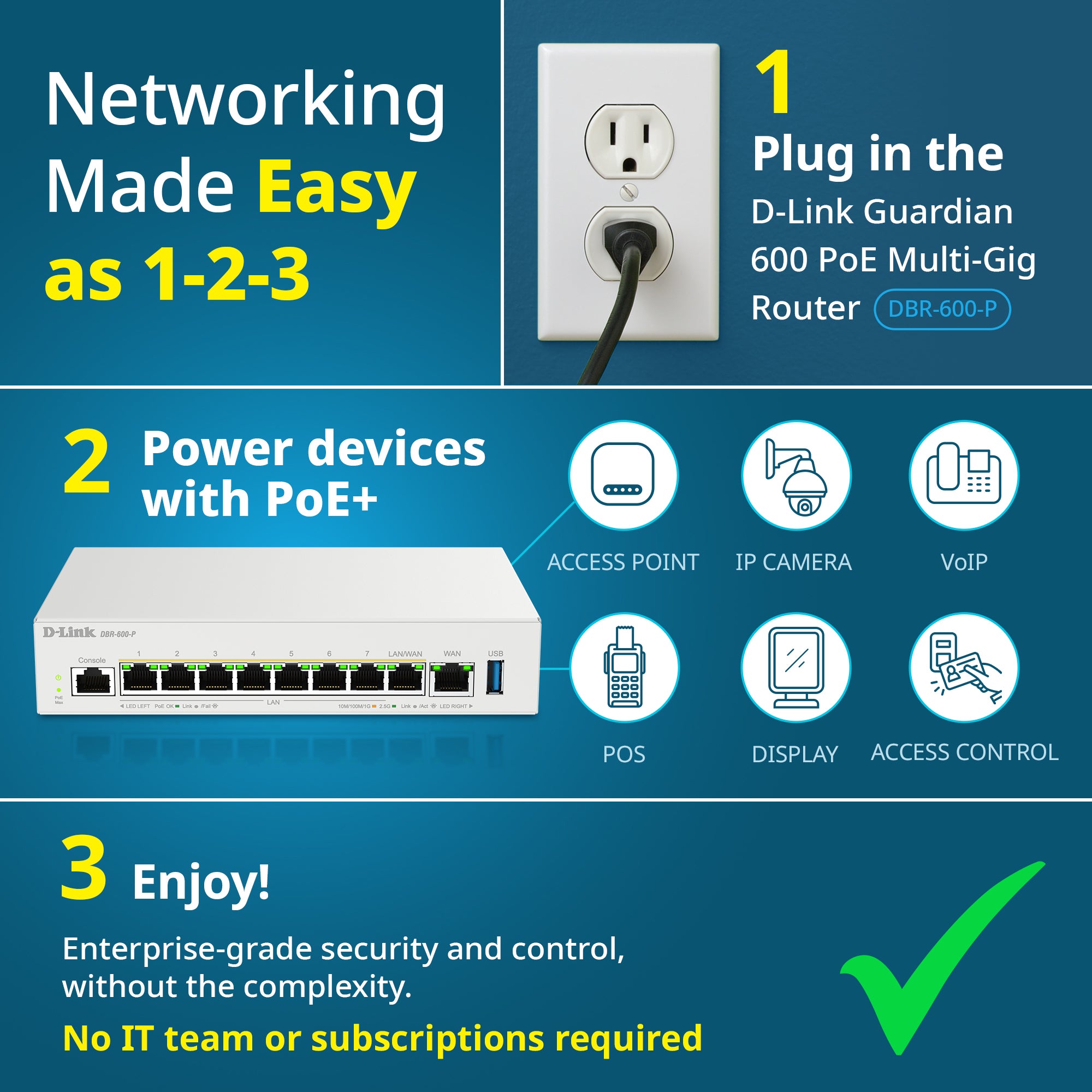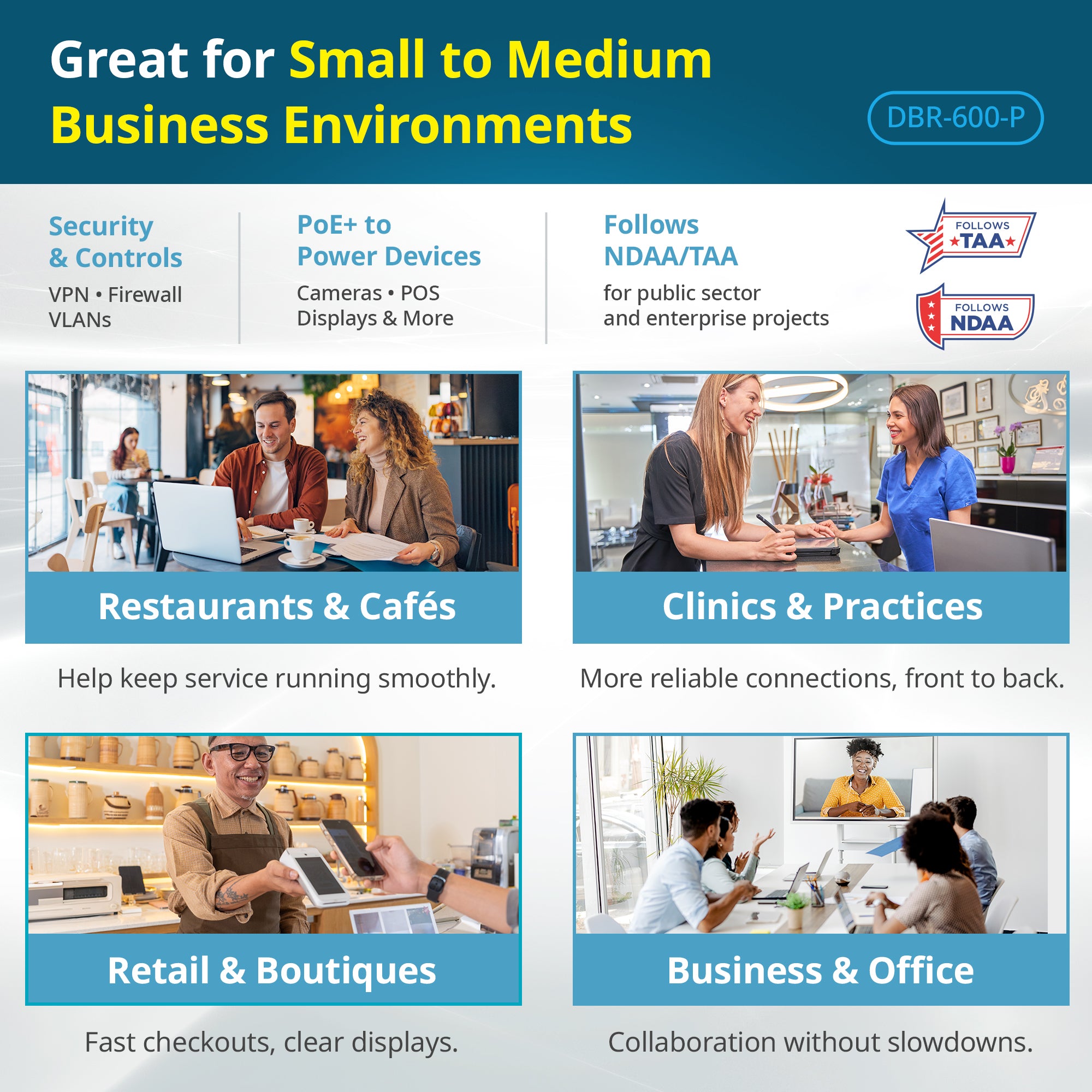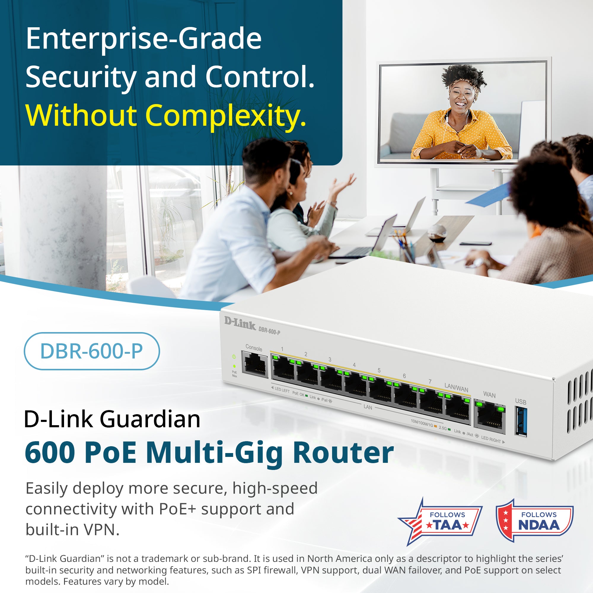 - Designed for small and medium sized businesses, Whether you're running a café, clinic, retail chain, or growing company, the D-Link Guardian 600 PoE Multi-Gig Router (DBR-600-P) helps you connect, enhance, and scale your business network - no IT department or subscriptions required