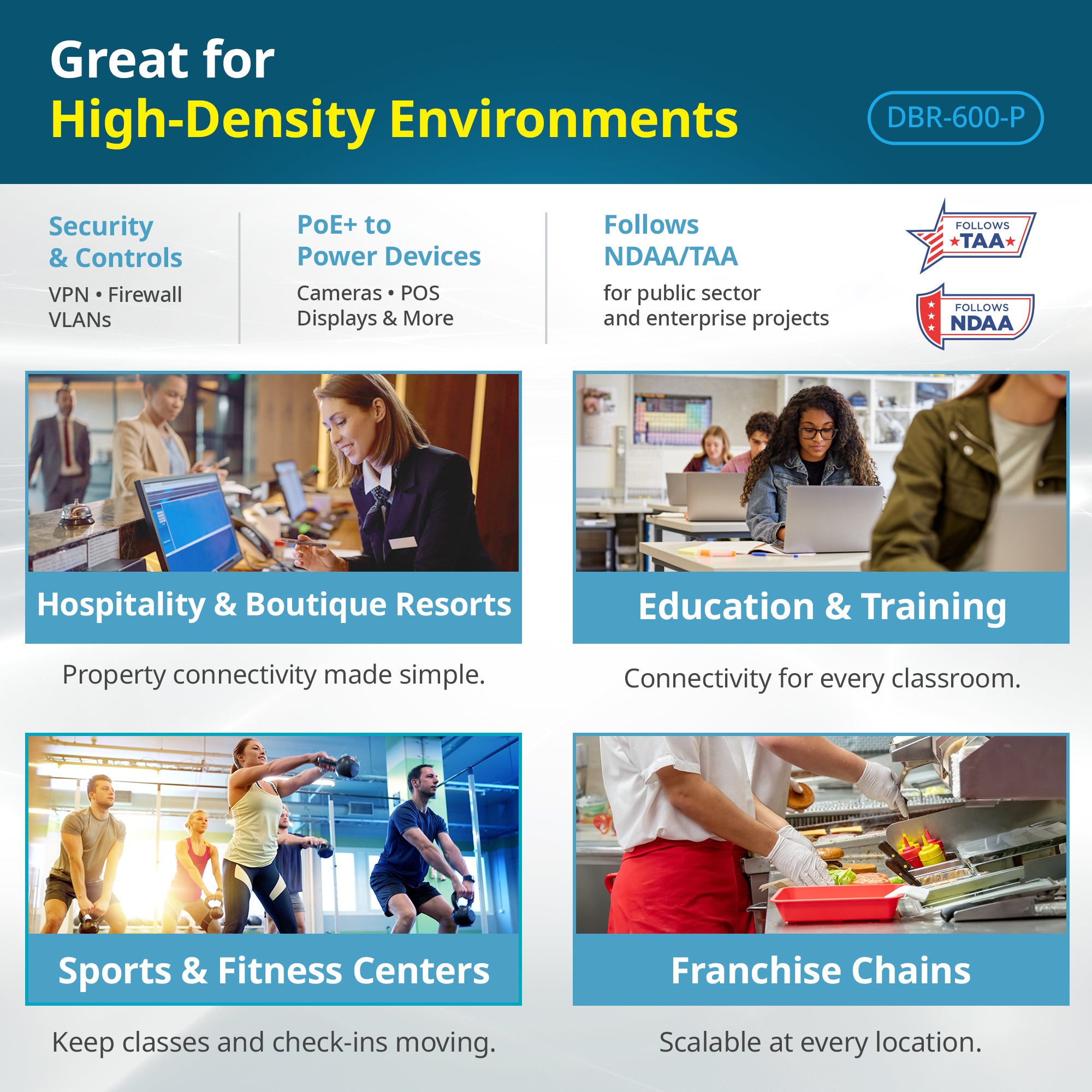- Sports & Fitness Centers: Support member check-in tablets, facility connectivity, and PoE-powered displays and cameras.