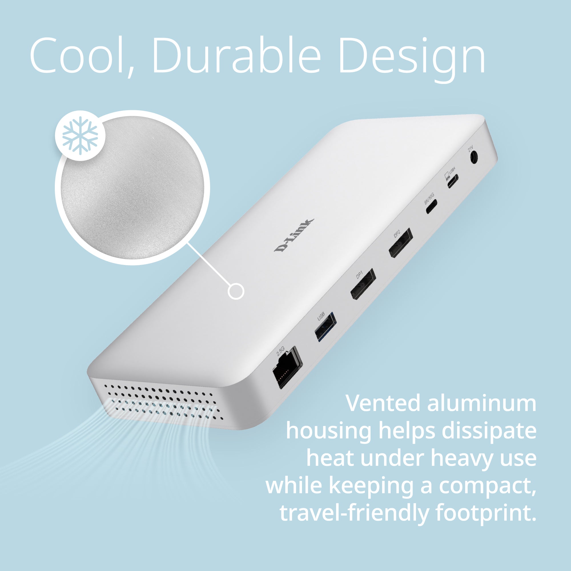 Help enhance productivity with dual display support, up to 40 Gbps* data transfer, and up to 100 W*** USB-C power delivery. The D-Link 9-in-1 USB4 Docking Station (DUF-901) brings 2.5 GbE**** networking, high-speed USB, and cool-running aluminum design together—so your desk stays fast, tidy, and ready for work.