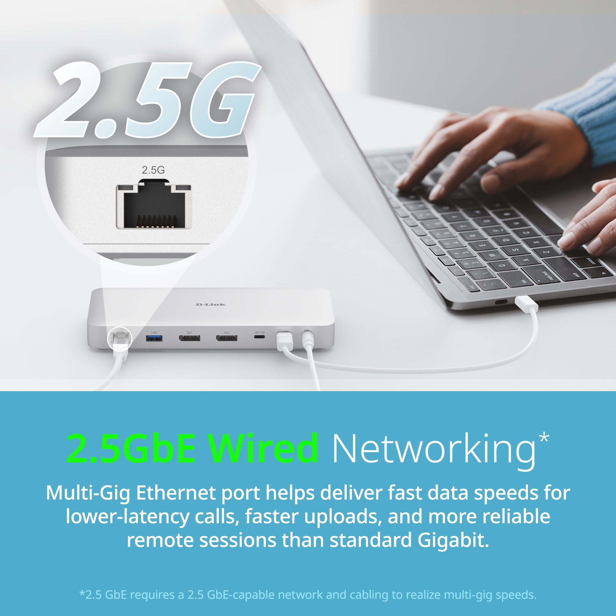 D-Link’s 9-in-1 USB Docking Station (DUF-901) is designed to help streamline multitasking and simplify your workflow. Connect DUF-901 to your computer for 2.5 GbE**** reliability, dual display extension, USB4 40 Gbps* transfers, and simultaneous laptop charging—then unplug and go when it’s time to move. Simple, repeatable, fast.