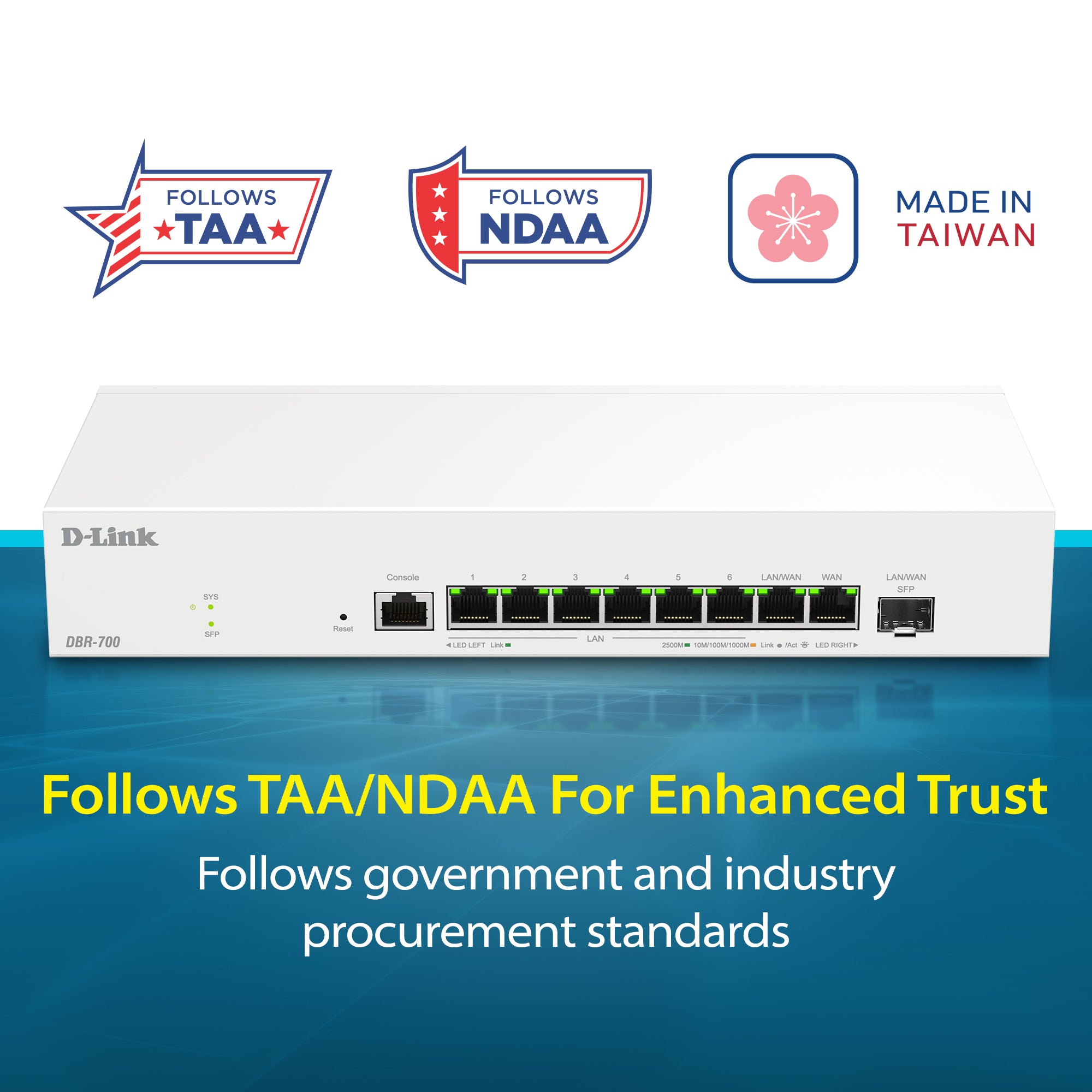 Designed for offices, classrooms, clinics, retail shops, and multi-site businesses, the DBR-700 combines multi-gig speed, VPN security, Wi-Fi management, advanced security protections, and backup connectivity in one compact, affordable router that requires no IT department or subscriptions required.