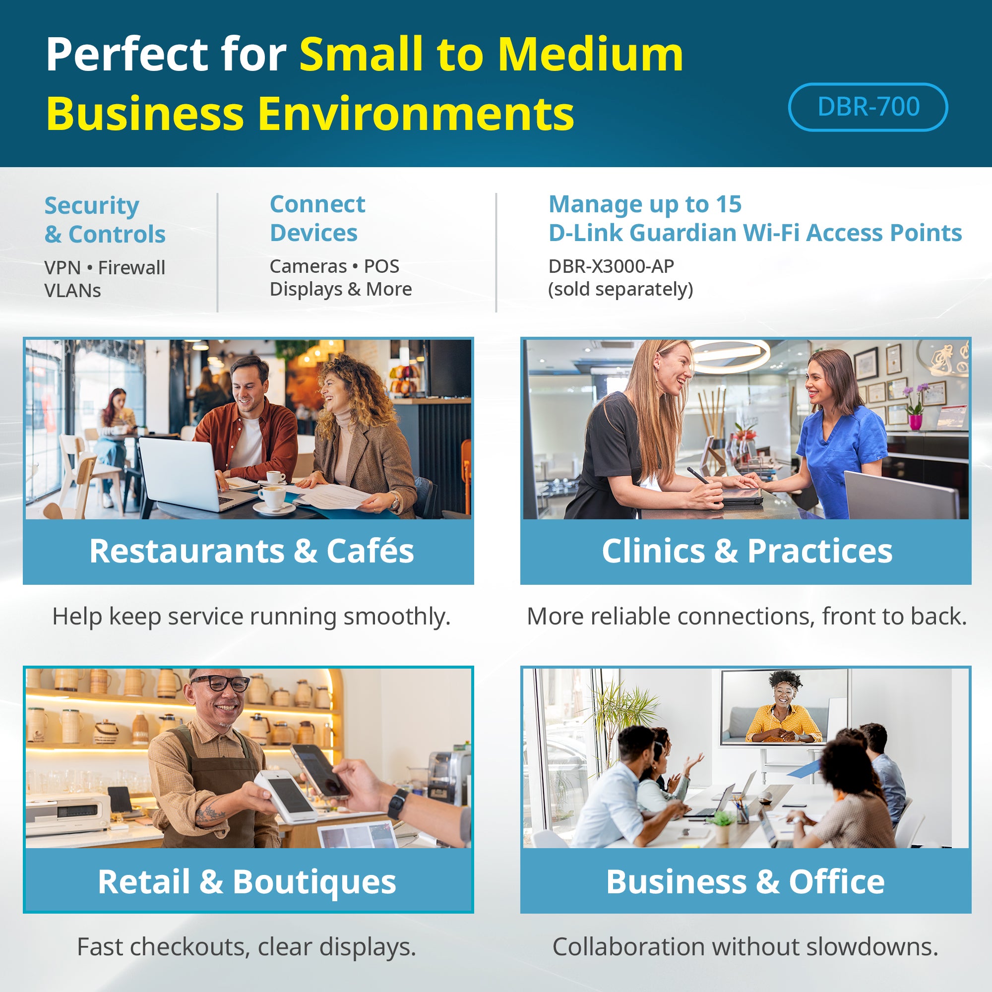Designed for small and medium sized businesses, Whether you're running a classroom, supermarket, boutique villa resort, restaurant, clinic, retail chain, or growing company, the D-Link Guardian 700 Pro Multi-Gig Router with SFP (DBR-700) helps you connect, enhance, and scale your business network - no IT department or subscriptions required