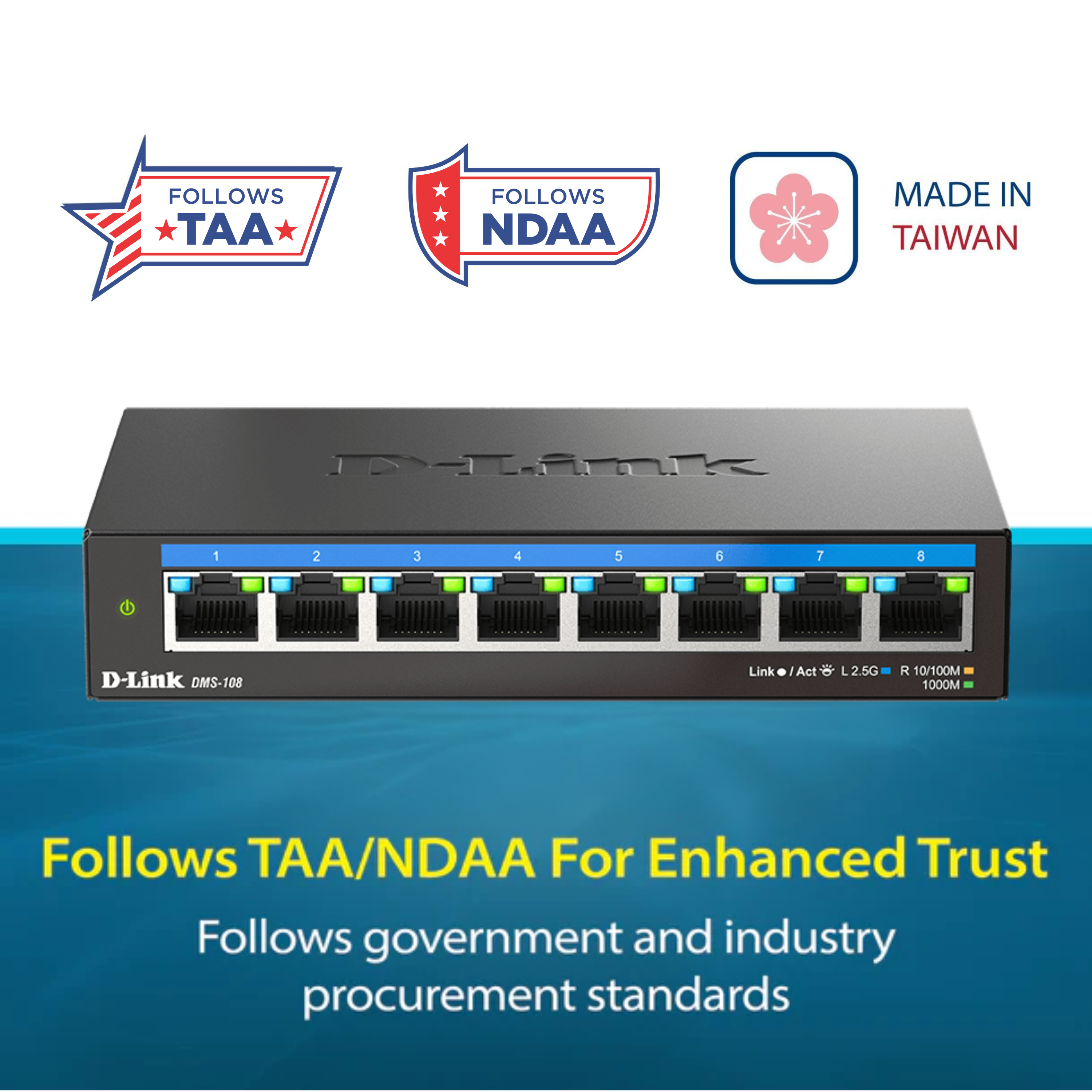 D-Link 8-Port 2.5Gb Unmanaged Gaming Switch (DMS-108) with 8 x 2.5G - Multi-Gig, Network, Fanless, Plug & Play