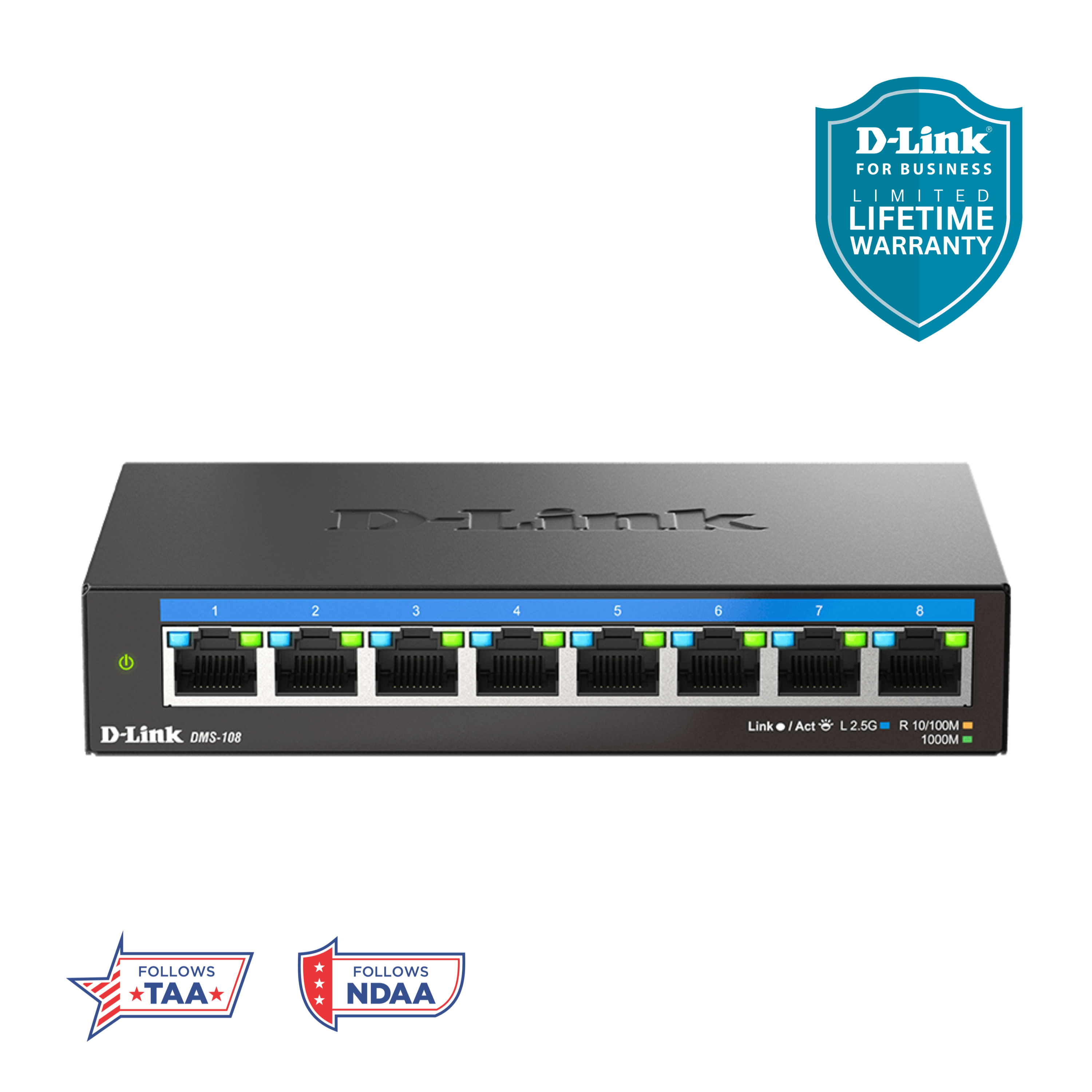 With auto-sensing ports, the DMS-108 intelligently senses the link speeds of your devices and adjusts between 3-speeds (100Mb/1G/2.5G) for compatibility and optimal performance. Using CAT5e or faster cables? Perfect! Instantly upgrade to 2.5 Gbps without the need to upgrade, reducing wiring costs and hassle.
