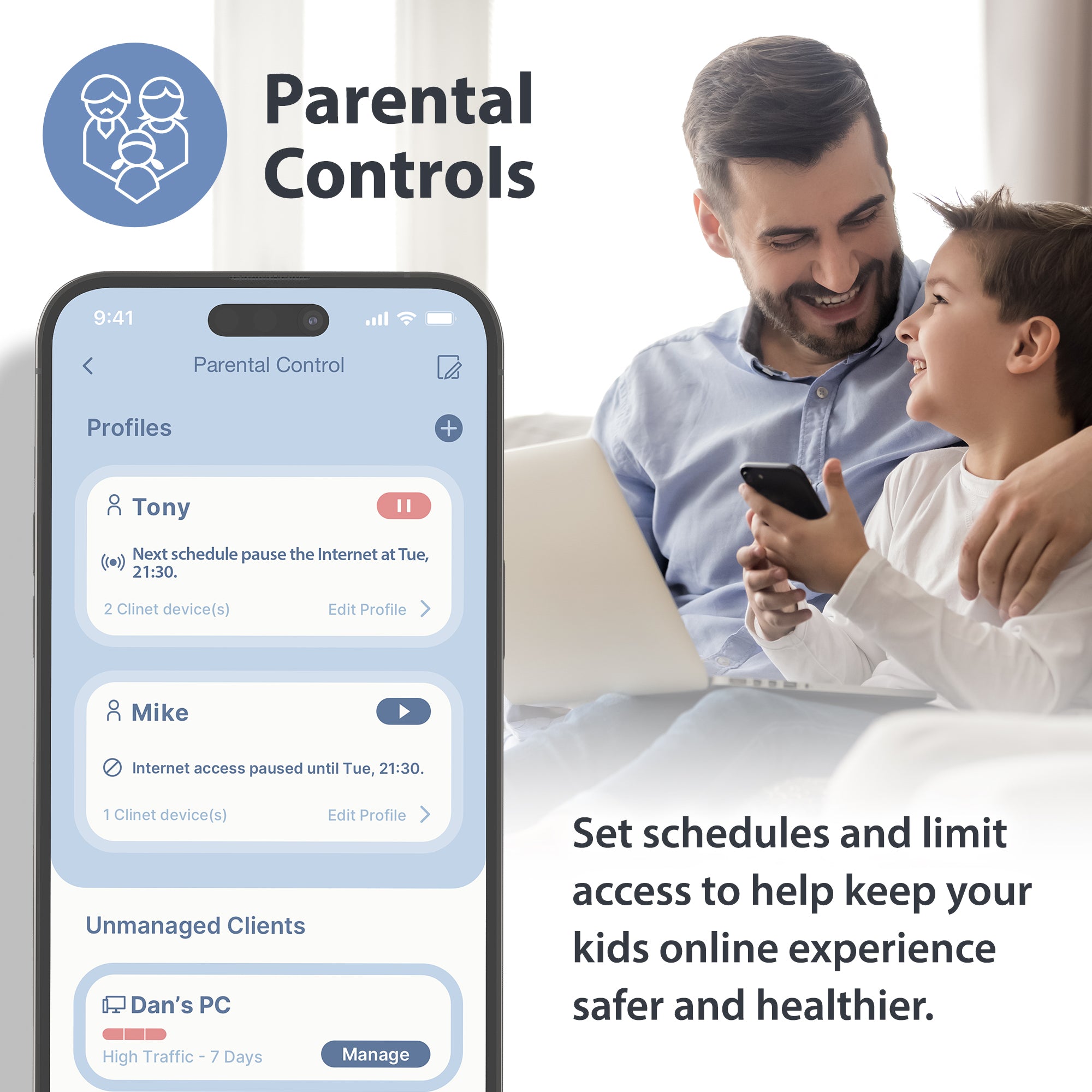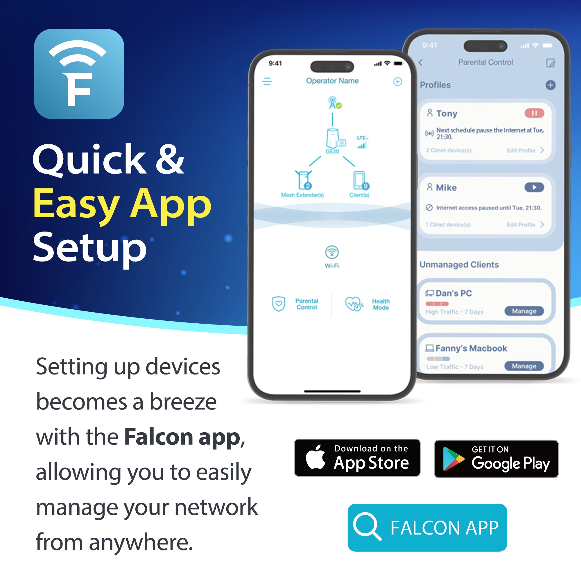 - SIMPLE SETUP & MANAGEMENT: The FALCON app simplifies setup and remote management, offering Enhanced Parental Controls, Guest Network, usage caps, and notifications.