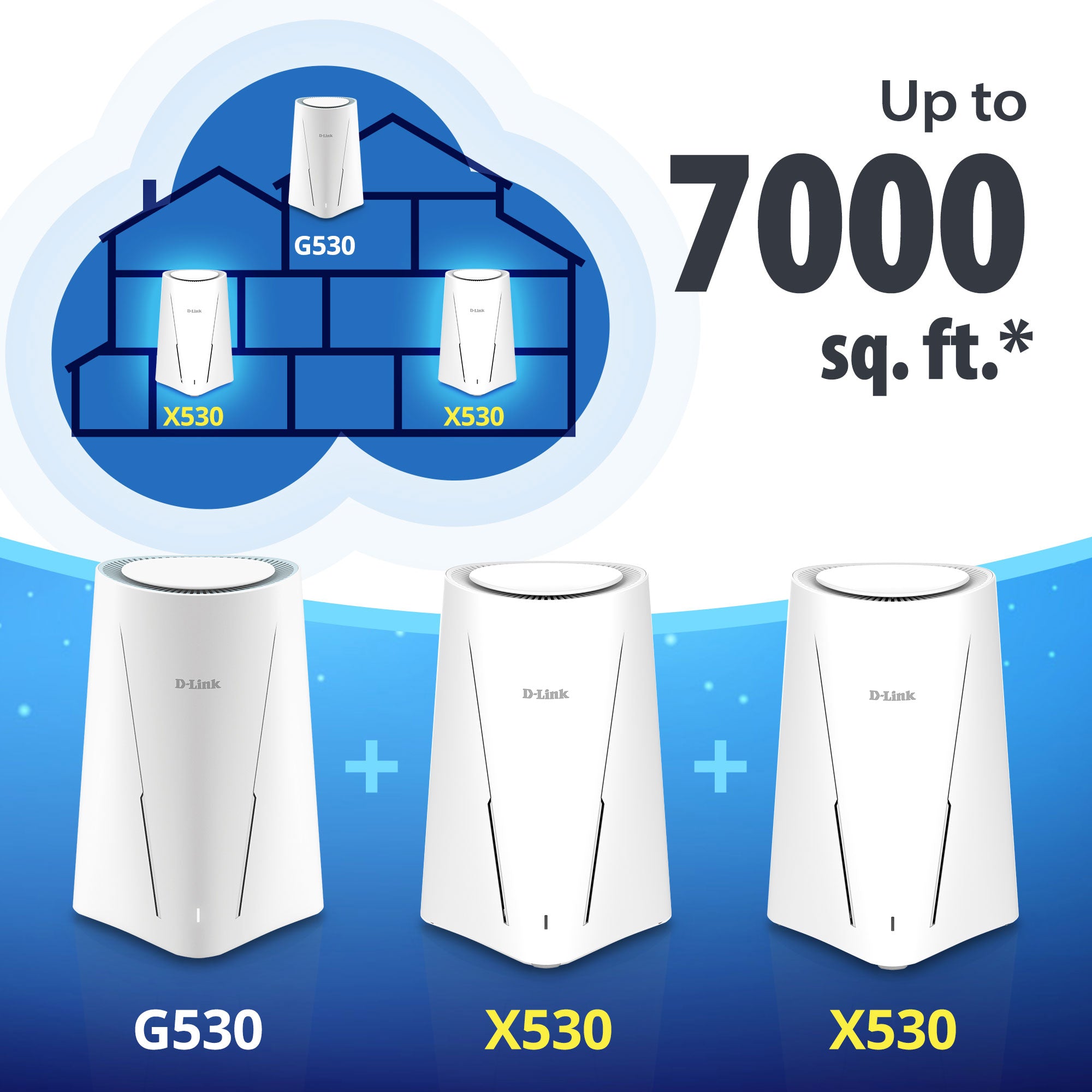 The G530X/3 5G NR AX3000 Wi-Fi 6 Mesh System comes with one AX3000 5G NR Cellular Gateway WiFi 6 Router (G530) and two D-Link AX3000 Desktop Wi-Fi 6 Range Extenders (X530) for seamless roaming, fast Wi-Fi 6 speeds, and whole-home coverage you can count on*.