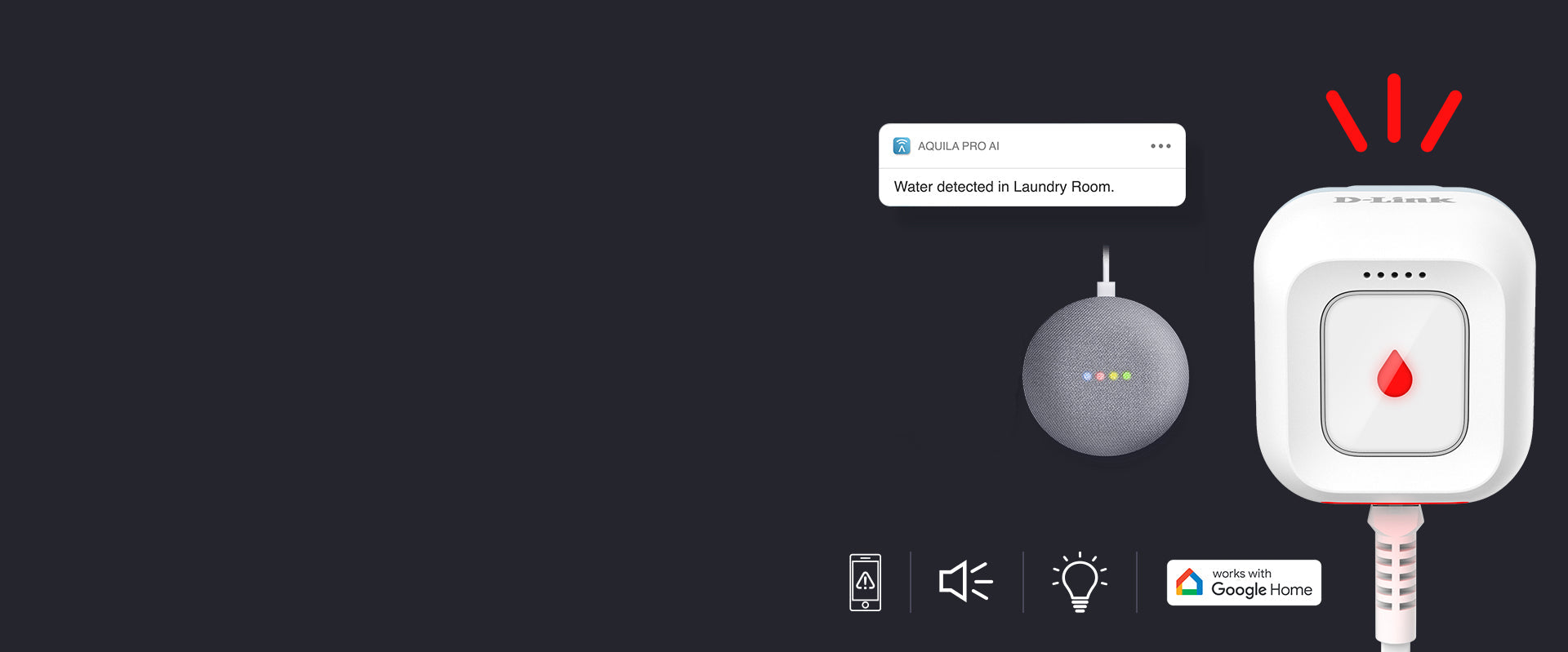 The AQUILA PRO AI app is more than just an app for easily setting up and monitoring your water leak sensor kit, it’s the central hub for managing all your D-Link smart devices, including routers, extenders, as well as other compatible MATTER-supported IoT products (if used with the D-Link MS30 Matter Router). * Google, Google Play and Google Home are trademarks of Google LLC