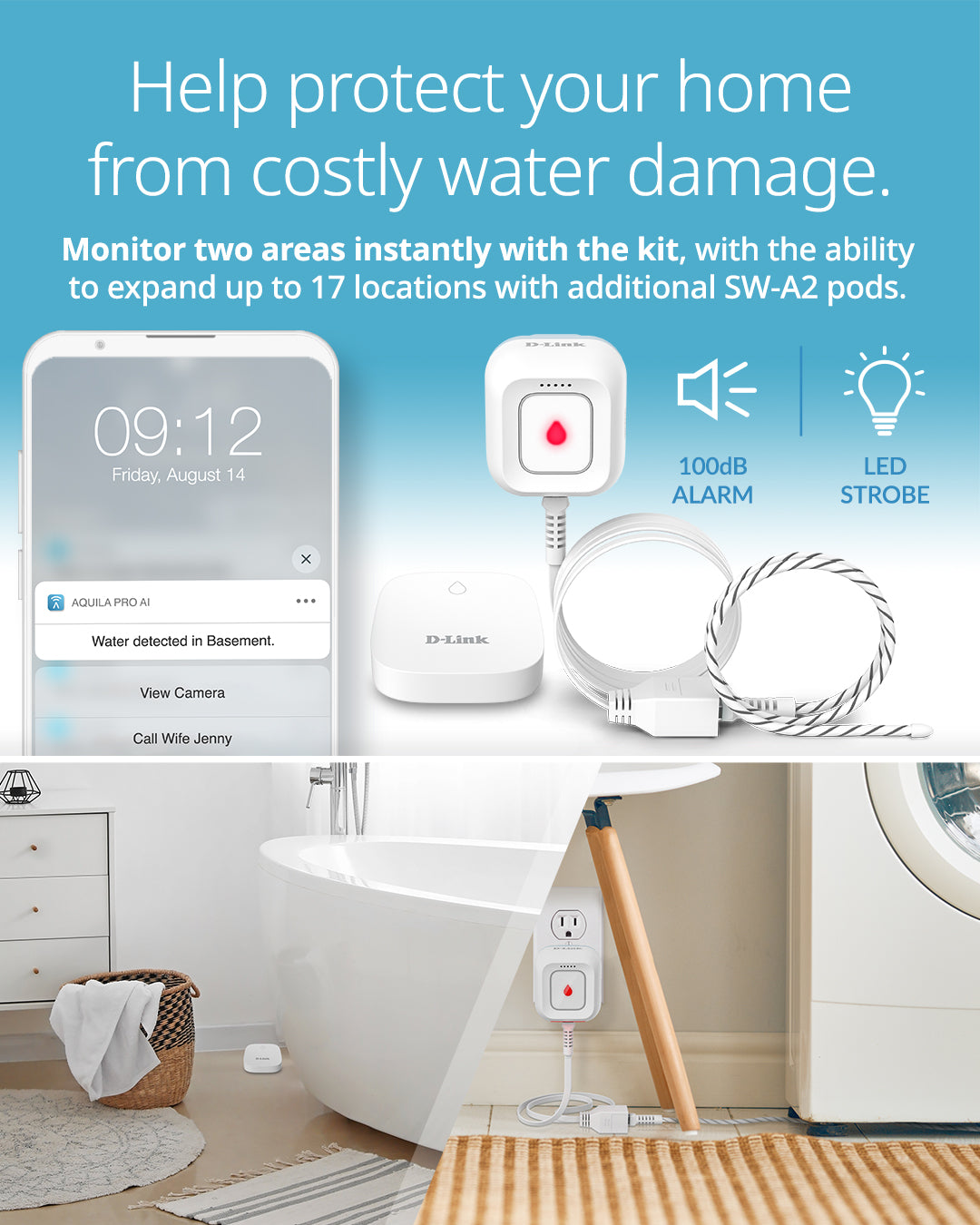 Water damage is one of the most expensive and disruptive home repair issues—but it’s often preventable. The D-Link SW-A11KT Smart Water Leak Sensor Kit gives homeowners an easy, affordable way to detect leaks early and respond quickly. With dual-sensor coverage (expandable to 17 locations by adding SW-A2 for each location), local alerts, and smartphone notifications via the AQUILA PRO AI app, it’s the smarter way to help protect your home—without monthly fees.