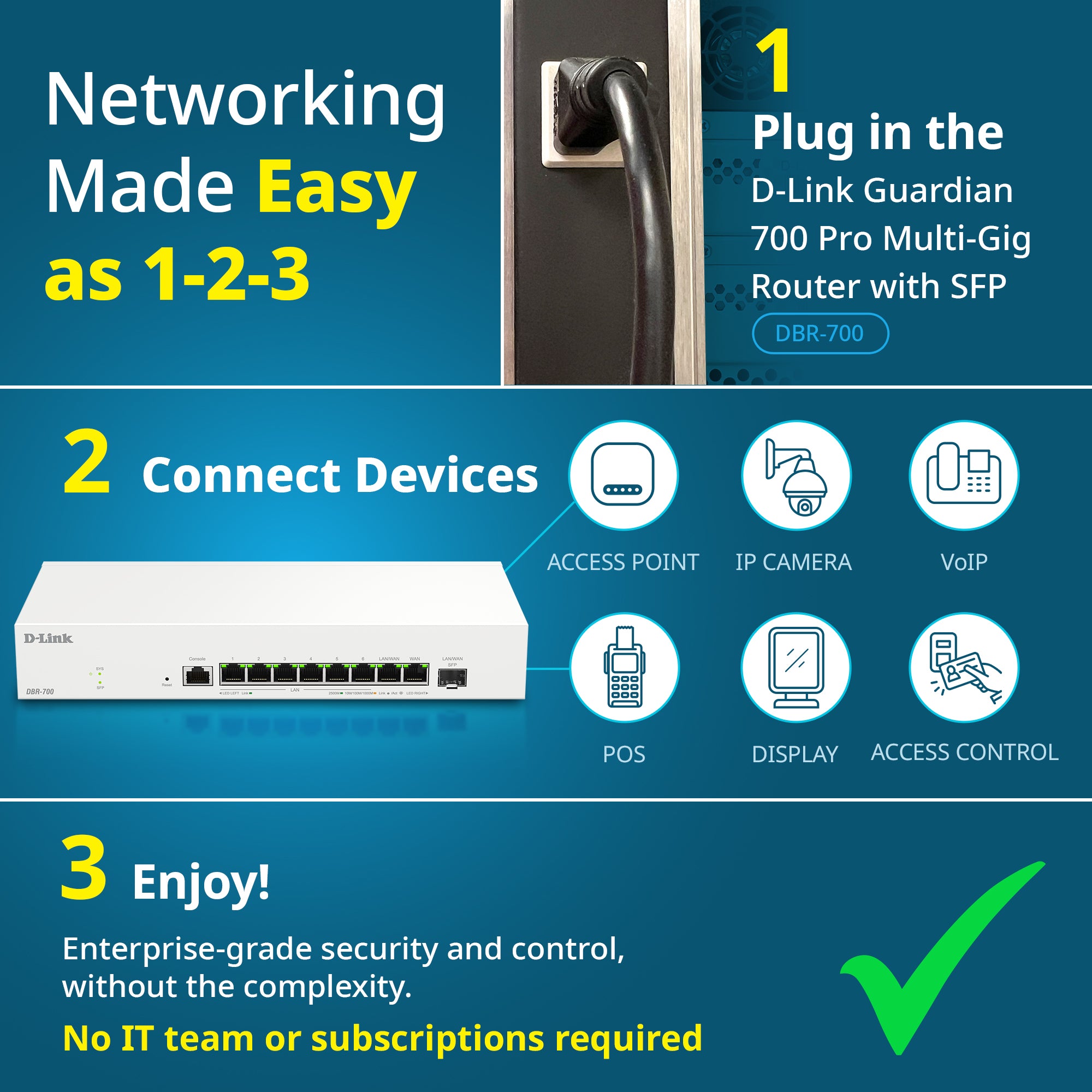 Designed for small and medium-sized businesses, whether you're running a classroom, supermarket, boutique villa resort, restaurant, clinic, retail chain, or growing company, the D-Link Guardian 700 Pro Multi-Gig Router with SFP (DBR-700) helps you connect, enhance, and scale your business network - no IT department or subscriptions required.
