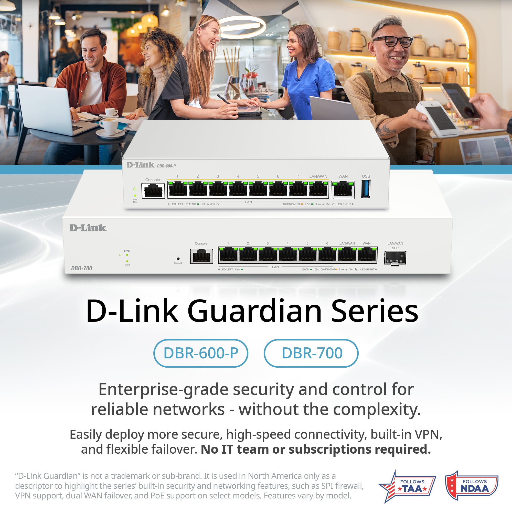 “D-Link Guardian” is not a trademark or sub-brand. It is used in North America only as a descriptor to highlight the series’ built-in security and networking features, such as SPI firewall, VPN support, dual WAN failover, and PoE support on select models. Features vary by model.